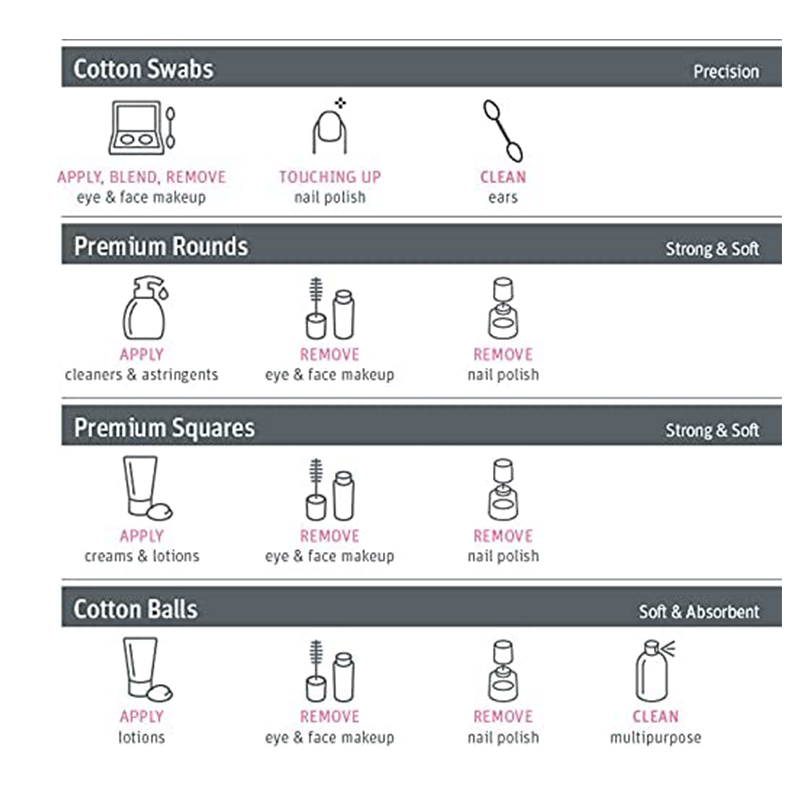 Використовується із засобами для зняття макіяжу, лаку, тоніками та іншими продуктами для очищення та заспокоєння шкіри.