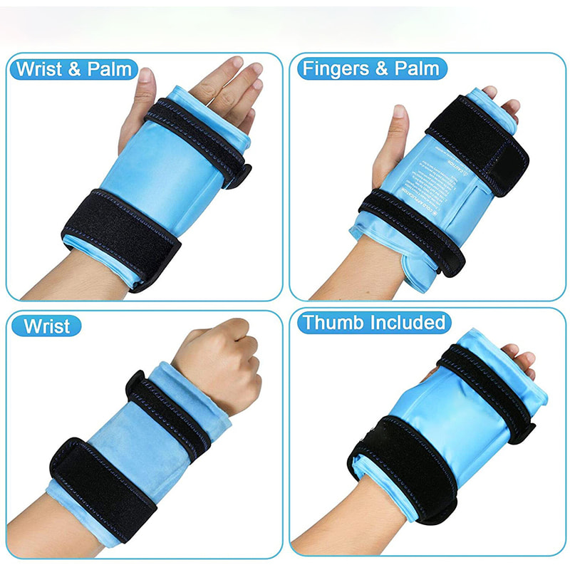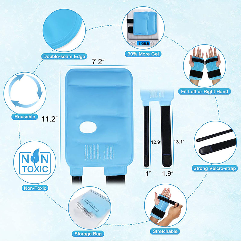 Зробіть холодний компрес за допомогою еластичного ремінця, щоб обернути травмоване зап’ястя, щоб допомогти прискорити відновлення після синдрому зап’ястного каналу та відновлення після операції, зменшити синці та набряки, пов’язані зі спортивними травмами, і полегшити хронічні болі в суглобах. Існує 4 способи використання компресу з льодом, націленого на пальці та зап’ястя. Щоб запобігти витоку гелю, обгортання з льодом на зап’ясті застосовує технологію подвійного шва для герметизації краю пакета з льодом.