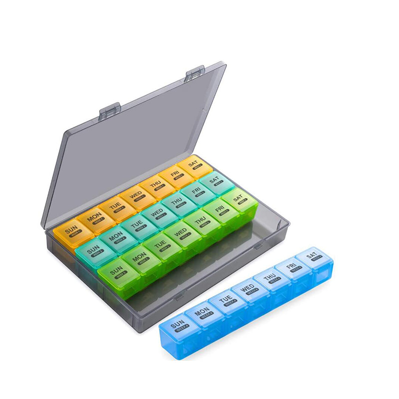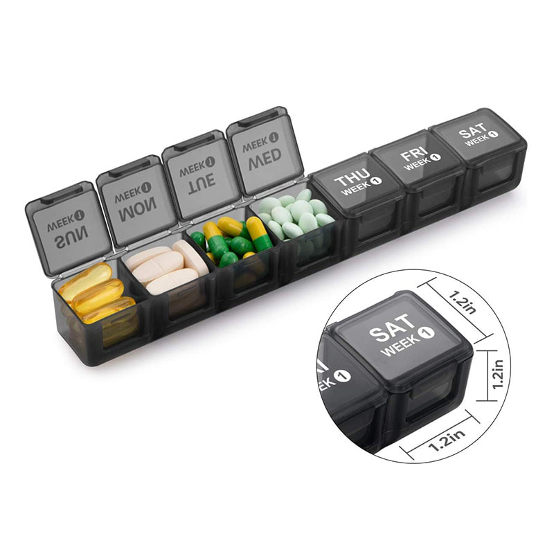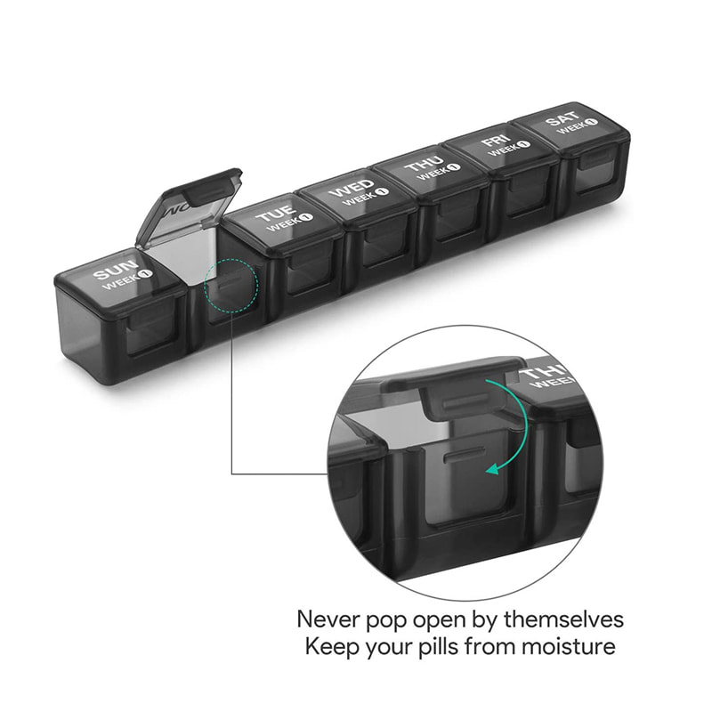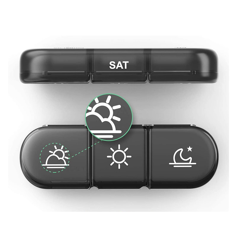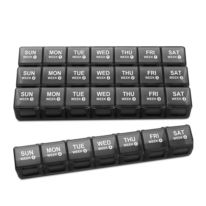 У нашій коробці для таблеток є чотири однотижневі контейнери для таблеток, які можуть упорядкувати ваші місячні ліки та підтримувати ваш режим прийому ліків до ранку та ввечері.