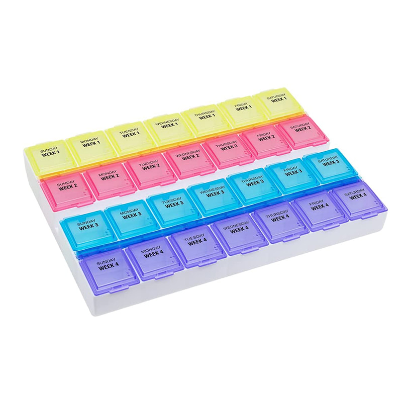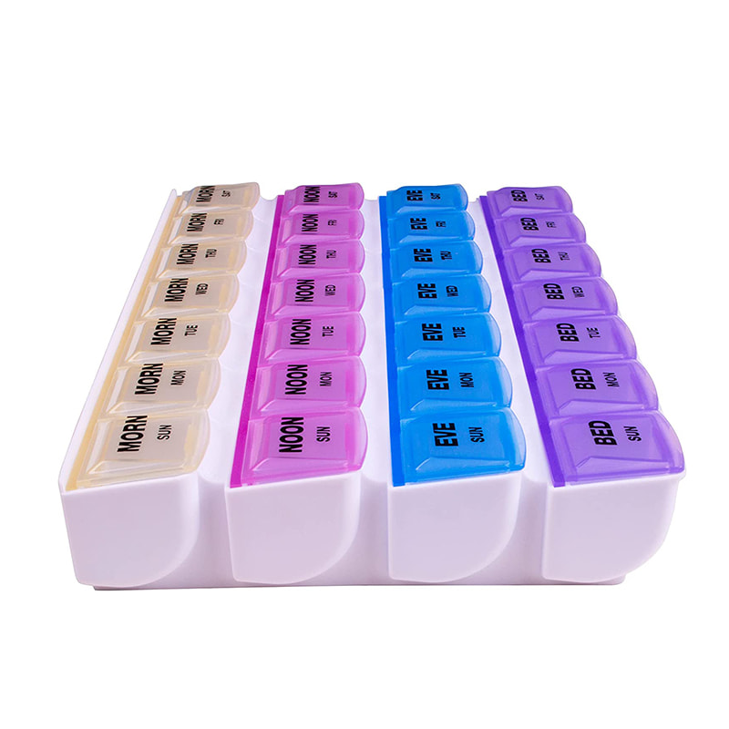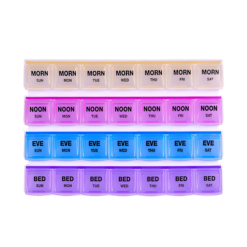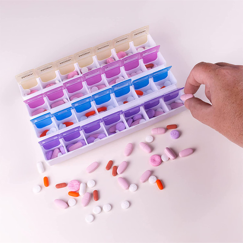 Ця 7-денна коробка з таблетками дозволяє організувати прийом ліків на ранок, день, вечір і перед сном. Прозорі кришки з кольоровим кодуванням, які легко відкриваються, дозволяють легко перевірити, чи правильно ви організували та прийняли таблетки