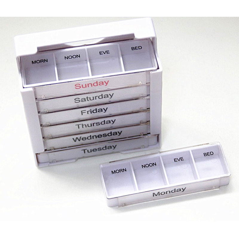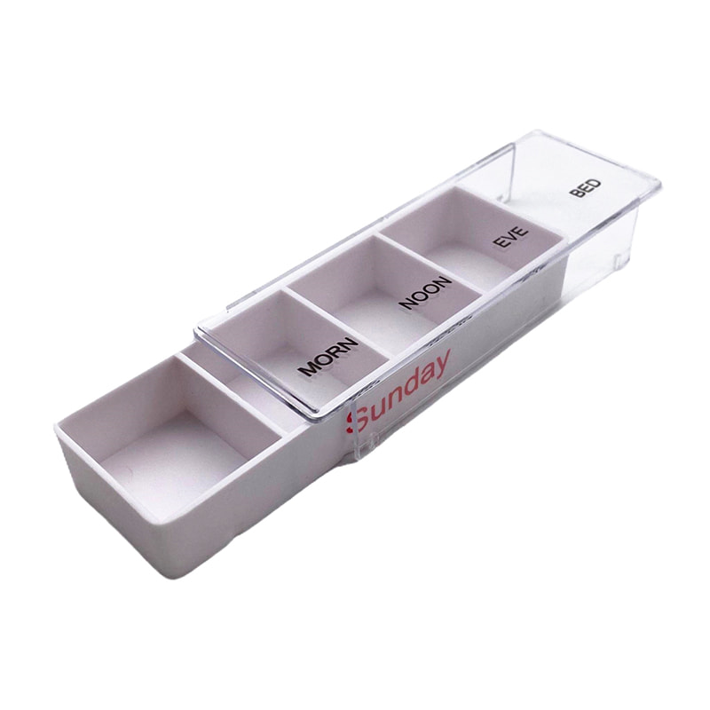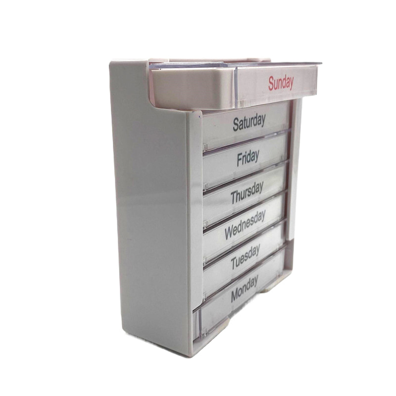 Кожен лоток призначений для одного дня тижня і має чотири відділення з ранковою, полуденною, вечірньою та нічною етикеткою.