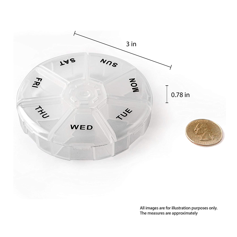 Цей органайзер для таблеток має розмір лише 3 дюйми, достатньо малий, щоб поміститися у вашій кишені! Виготовлений із міцного та міцного напівпрозорого пластику.