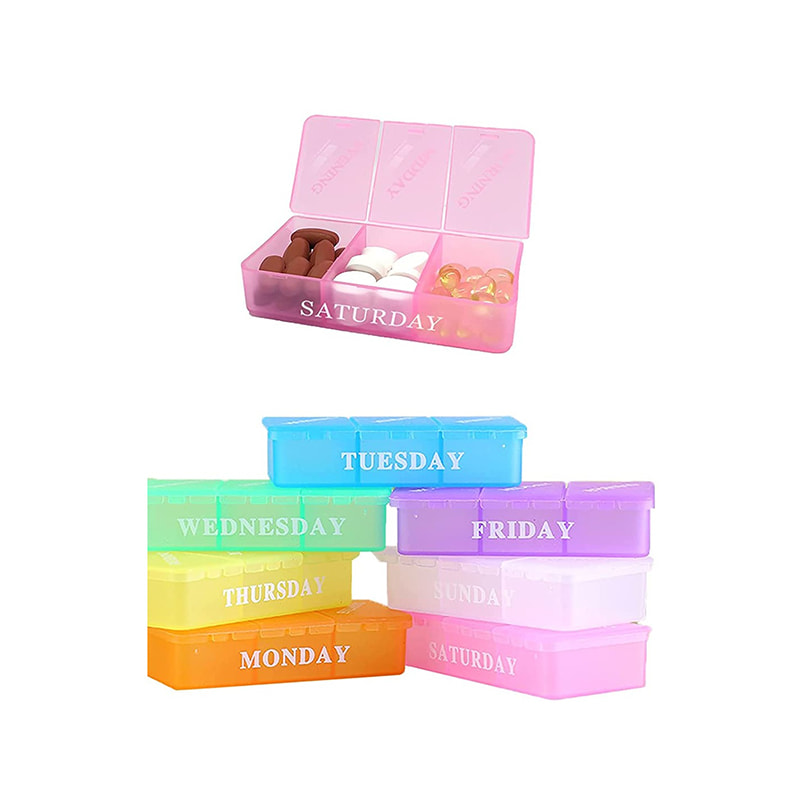 Менеджер таблеток тричі на день має 21 відділення з 7 різними кольорами та написами дня тижня.